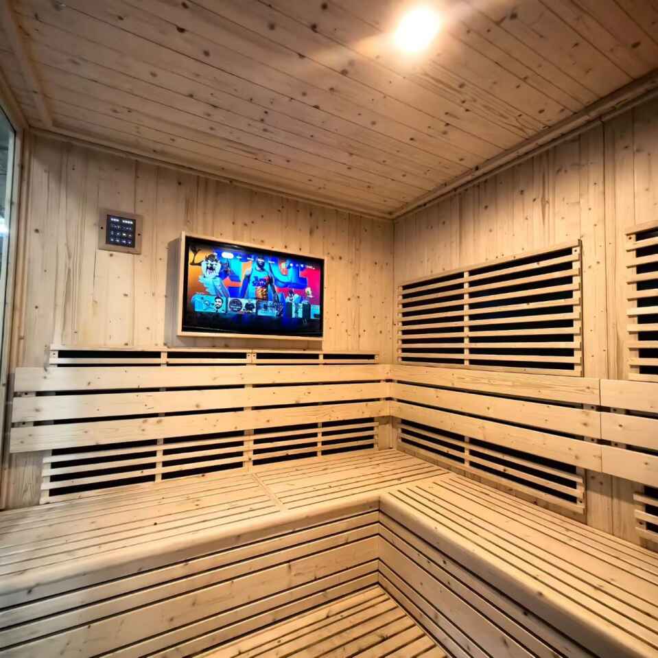 Sisseehitatud LCD-televiisor (nähtav pildil) muudab saunaelamuse: