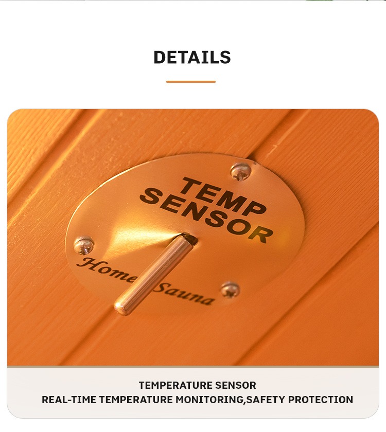 - Reaalajas temperatuuri reguleerimise süsteem: sisseehitatud temperatuuriandur jälgib täpselt sisetemperatuuri, et tagada sauna ohutus.