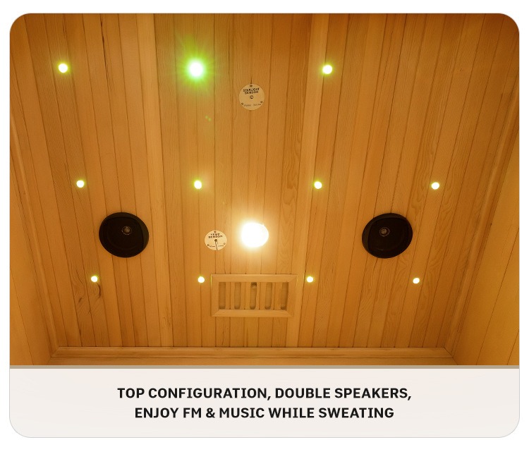 Üleval on konfigureeritud kahe kõlariga süsteem, mis toetab FM-raadiot ja muusika taasesitust. Higistades saate nautida lemmikmeloodiaid või raadiosaateid, mis täiustab kaasahaaravat saunakogemust.