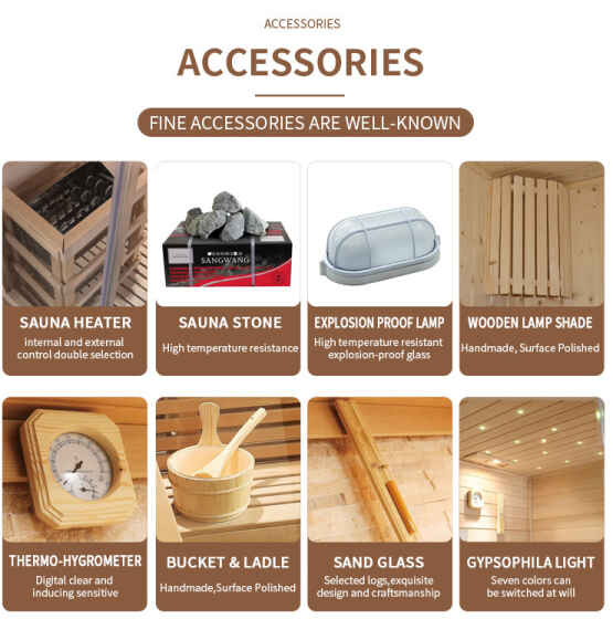 TheVälisklaasuks välisleiliruumon varustatud 8 kategooria põhitarvikutega, mis katavad sauna kogu protsessi vajadused, näidates kvaliteeti üksikasjalikult: