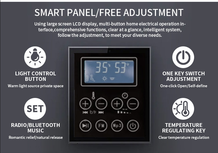 Lisafunktsioonid: integreerib Bluetoothi muusika taasesituse ja valguse atmosfääri reguleerimise (nt seitsmevärvilised tähetuled), muutes saunaprotsessiVälisklaasuks välisleiliruumnautida nii kuulmis- kui ka visuaalseid naudinguid.
