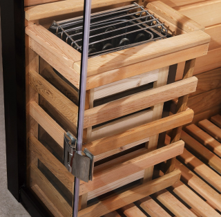 - Naturaalsest seedripuidust sisemus: sisemus on vooderdatud esmaklassilise seedripuuga, mis kuumutamisel eraldab peent rahustavat aroomi. Seedril on ka suurepärane soojuse säilivus, mis hoiab ruumi tõhusalt soojas ja talub niiskust, et vältida kõverust.